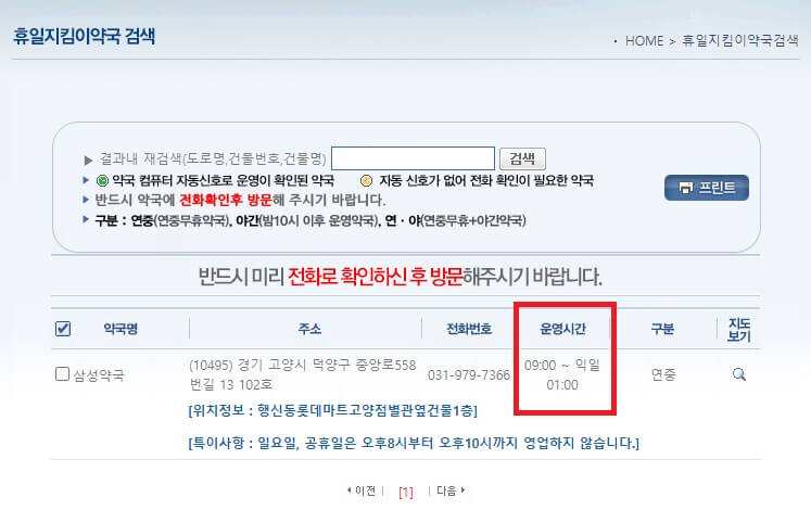 저는 고양시 덕양구의 심야 약국을 검색해 보았는데요. 운영시간이 09:00 - 익일 01:00시로 심야약국 운영 시간대인 22:00 - 익일 01:00시에 영업을 하는 약국이 한 곳 확인됩니다.