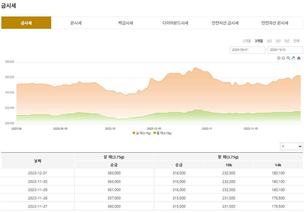 이렇게 금 시세는 시시각각 바뀌기 때문에 금을 거래할 때에는 시세를 알고 있어야 보다 더 싸게 사고, 보다 더 비싼 값을 받고 팔 수 있습니다.