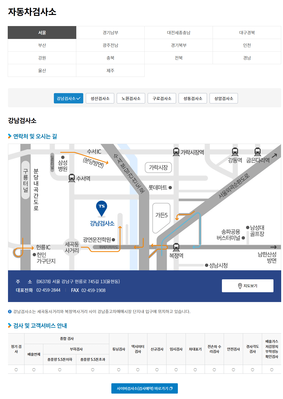 아래 그림과 같이 한국교통안전공단 사이트에서 지역별로 가까운 검사소를 검색해 보실 수 있습니다.