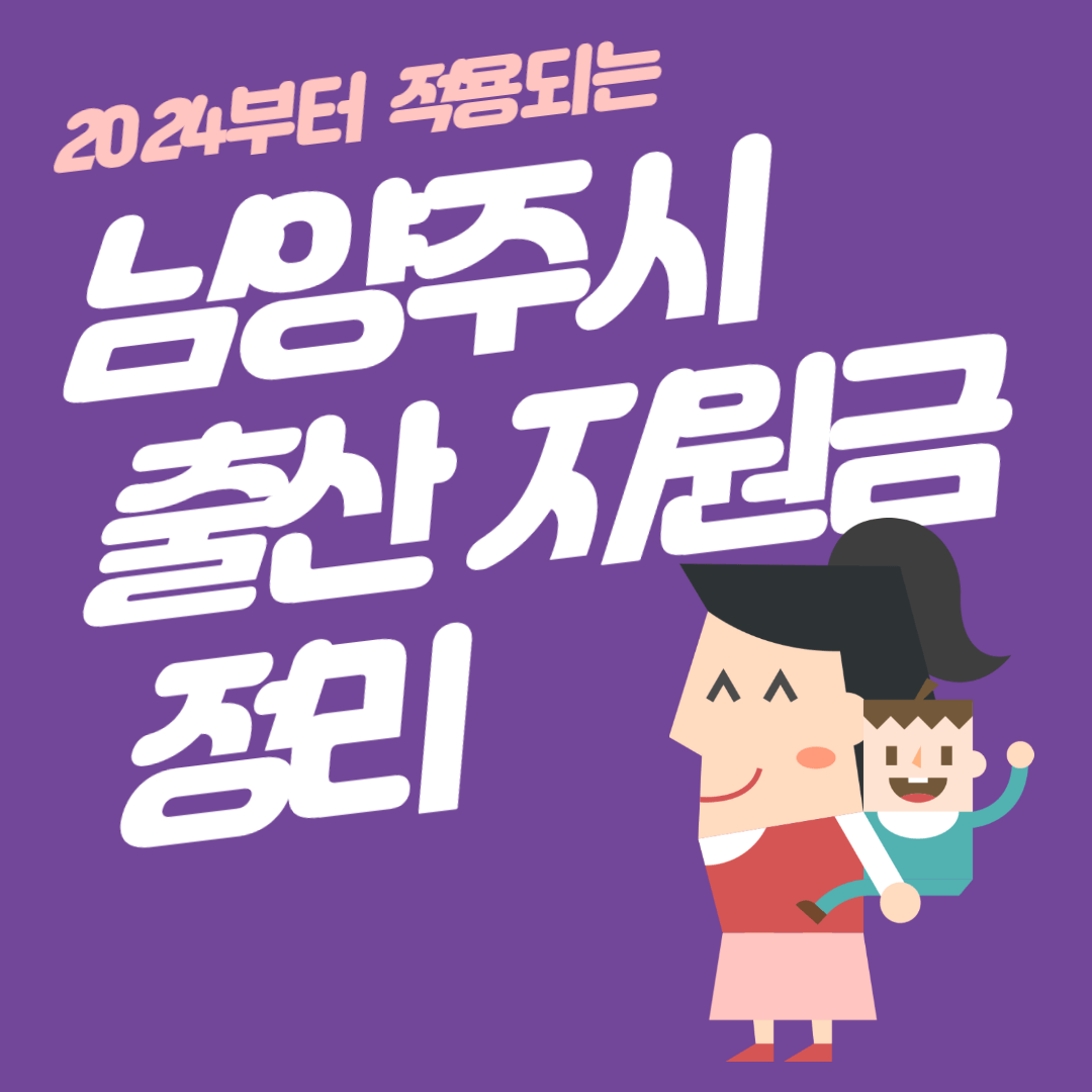 2023년이 지나가고 2024년이 다가오고 있습니다. 저출산 현상이 점점 심각해지면서 정부가 내년에는 아동 양육에 드는 경제적 부담을 줄여주기 위하여 해주는 각종 지원을 확대한다고 하는데요. 특히 매달 현금으로 지원해 주는 부모급여가 매달 100만 원으로 대폭 인상되어 아이 출산을 앞두고 있는 부모들에게 경제적으로 도움이 될 것 같습니다. 전국 공통으로 지원되는 사항에 더해 남양주시에서 지원하는 지원금, 산후조리 혜택에 대해서 알려드리도록 하겠습니다. 남양주시 기준 신생아 1명 당 최대 3,250만원의 지원 혜택을 받을 수 있으니 자세히 살펴봐주시기 바랍니다. 기타 지역 출산지원금은 여기 클릭하시면 확인 가능합니다.