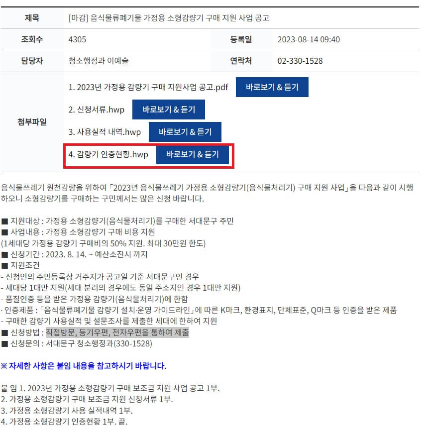 2. 조건에 맞는 음식물 처리기를 구입합니다. 보통 사업 공고의 첨부파일로 제품 리스트가 첨부되어 있습니다. 아래 예시는 2023년도 서대문구에서 진행한 사업 공고이며 첨부파일을 보시면 감량기 인증현황이라고 해서 지원 대상 리스트가 첨부되어 있습니다.